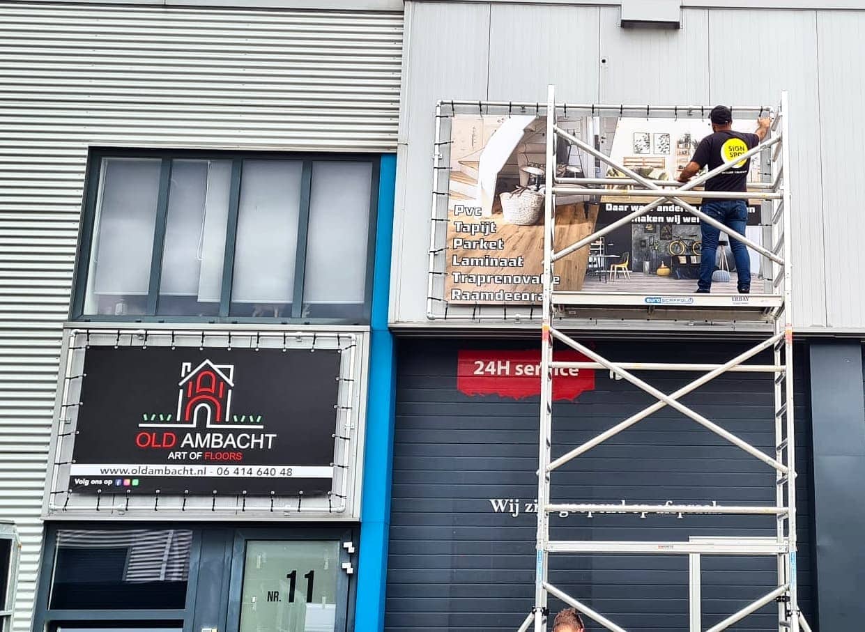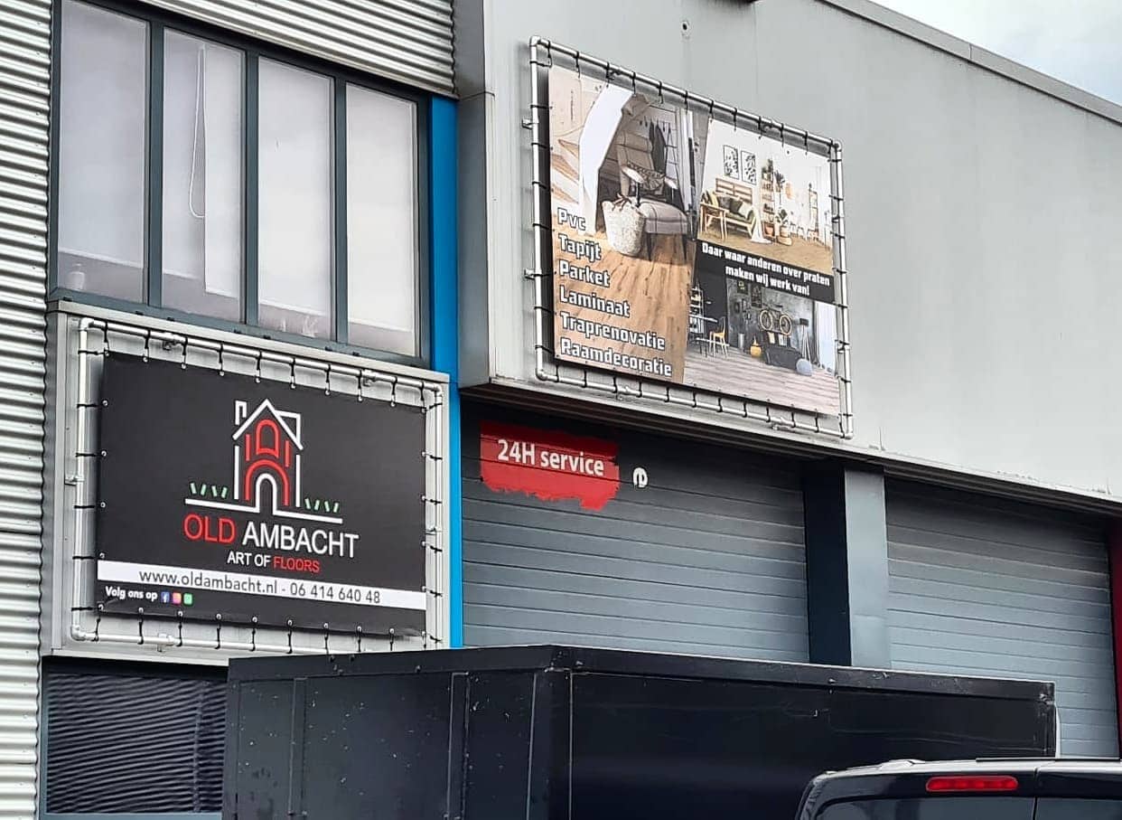 Het pand van Old Ambacht valt nu mooi op door middel van twee full color spandoeken inclusief frame.